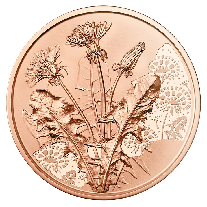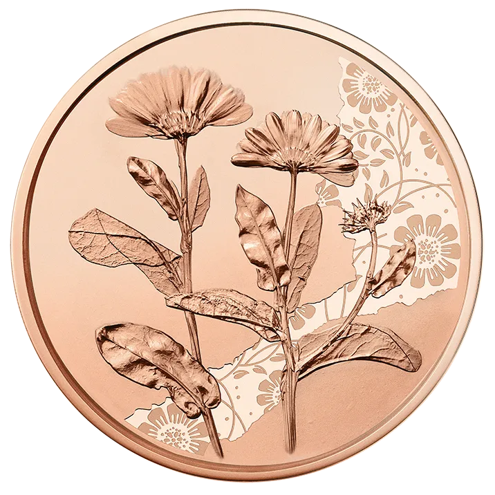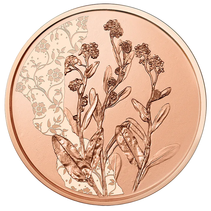 Auf den Münzbildern haben sich eine Rose, ein Löwenzahn, eine Ringelblume und ein Vergissmeinnicht selbstverwirklicht. Dafür wurden Abdrücke echter Pflanzen verwendet, so gleichen sie ihren realen Vorbildern vollkommen. Die Blumen auf den Münzen sind für immer lebendig.