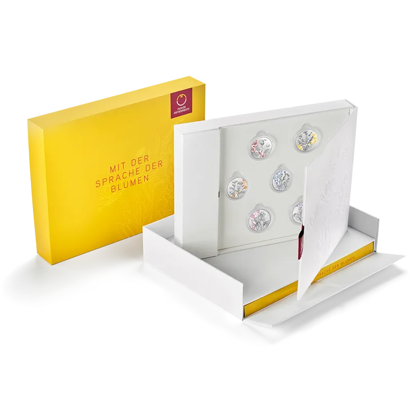 Die Original-Sammelkassette der Serie birgt alle sieben Blumen-Münzen in Silber PP, sowie das Buch zur Serie "mit der Sprache der Blumen" in deutscher Sprache: