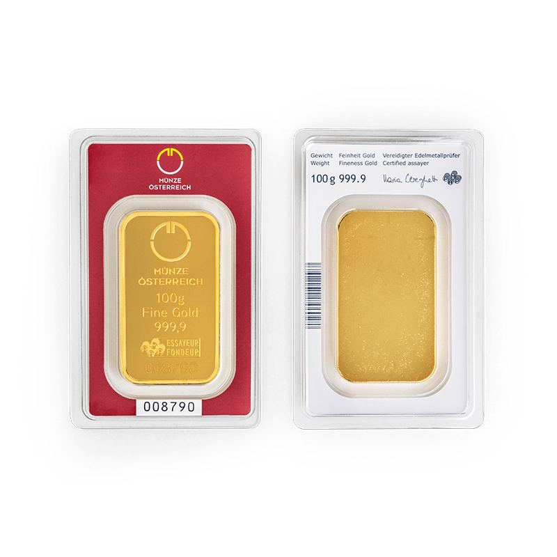 Die Münze Österreich AG bietet Anleger:innen eine breite Auswahl an Goldbarren von 1 Gramm bis 1 Kilogramm – gefertigt aus 24 Karat Gold (Feingehalt 999,9/1000). Die Prägung der Barren informiert über Hersteller, Gewicht, Feinheit und Seriennummer.