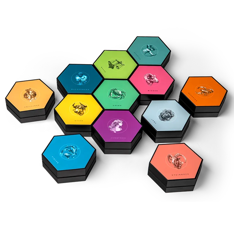 Das Komplett-Set besteht aus 12 einzelnen Etuis, die jeweils das Symbol des entsprechenden Sternzeichens tragen: Widder, Stier, Zwillinge, Krebs, Löwe, Jungfrau, Waage, Skorpion, Schütze, Steinbock, Wassermann und Fische. Jedes dieser sechseckigen Etuis ist aus hochwertigem Kunststoff gefertigt und bietet nicht nur Platz für eine Münze der Serie, sondern auch für das zugehörige Echtheitszertifikat.