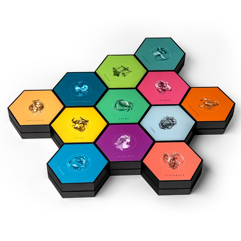 Ein besonderes Highlight sind die integrierten Magneten, die es ermöglichen, die einzelnen Etuis frei miteinander zu verbinden. Dadurch können Sammler die Reihenfolge ihrer Münzen individuell gestalten – sei es in der traditionellen Abfolge der Sternzeichen, nach einem persönlichen Horoskop oder nach einer ganz eigenen Ordnung.