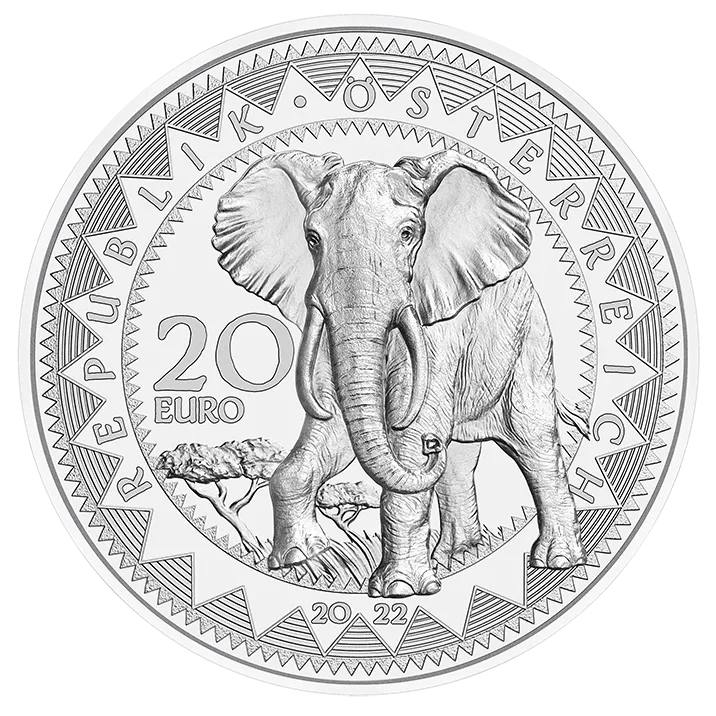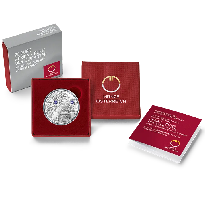 Blau bedeutet Gleichmut, Blau bedeutet Gelassenheit. Blau steht für die Ruhe, die die Elefanten Afrikas auf die Menschen ausstrahlen. Saphirblau funkeln die Augen des Kraft-Tiers mit der dicken Haut, sie sind aus Kristallen von Swarovski®. – Auf der vierten Tiermünze der Serie „Augen der Kontinente“ blitzt in seinen Augen Zuversicht auf.