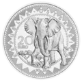 Die Wertseite zeigt einen Elefanten in einer Savanne. Das Motiv wird von einem Ornament umrundet, das an afrikanische Stoffmuster erinnert.