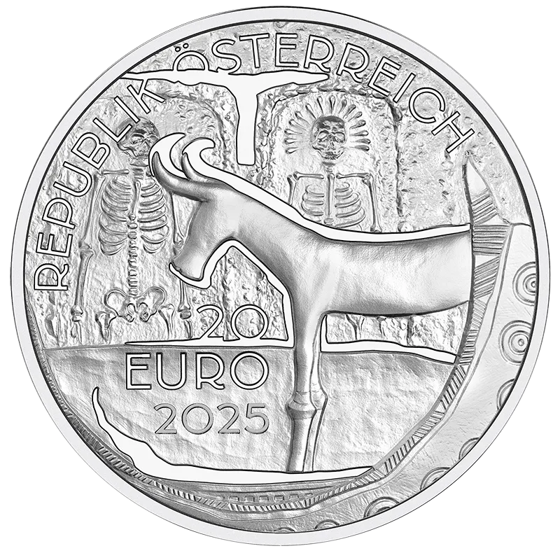 Auf der Münze sind historische Darstellungen in modernem Design zusammengefügt. Die Wertseite zeigt bedeutende Fundstücke aus dem berühmten prähistorischen Gräberfeld in Hallstatt: ein zeremonielles Kuh-Kälbchen-Gefäß, zwei Skelette sowie Ornamente von Gürtelblechen.