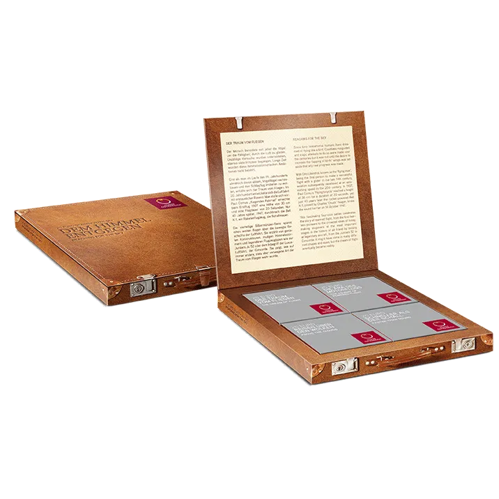 Die vierteilige Silbermünzen-Serie spannt einen weiten Bogen über die bewegte Geschichte der Luftfahrt. Sie erzählt von genialen Konstrukteuren, mutigen Himmelsstürmern und legendären Flugzeugtypen wie der Junkers Ju 52 oder dem Inbegriff der Luxus-Luftfahrt, der Concorde. Sie zeigt, wie auf immer andere, stets aber verwegene Art der Traum vom Fliegen wahr wurde.