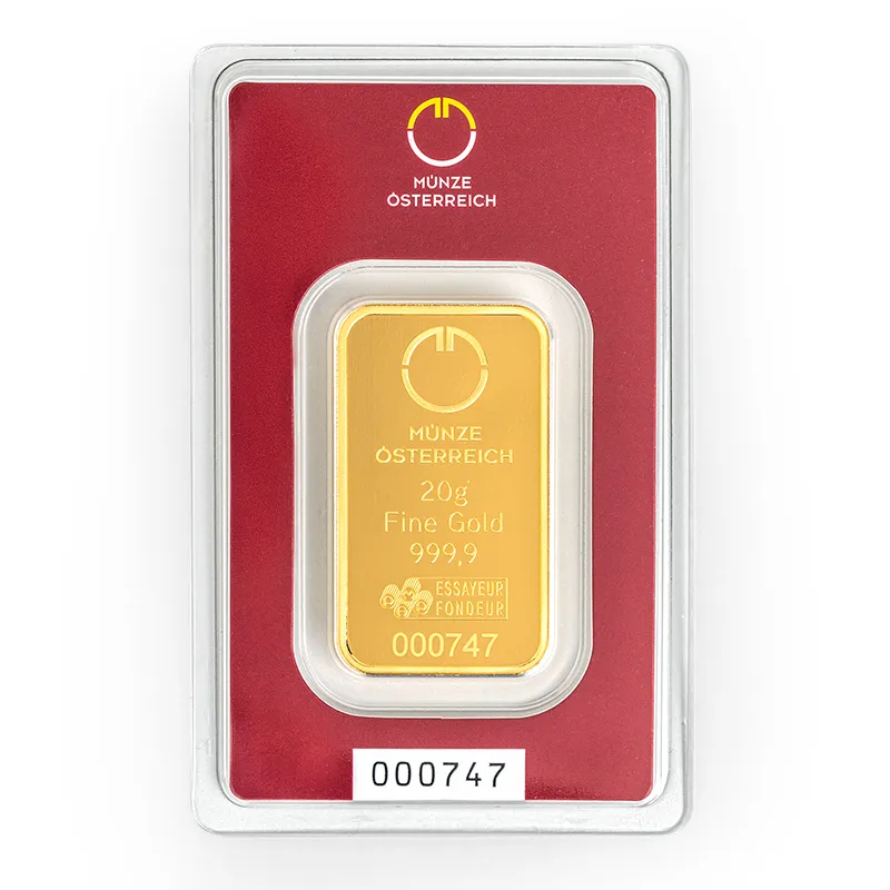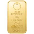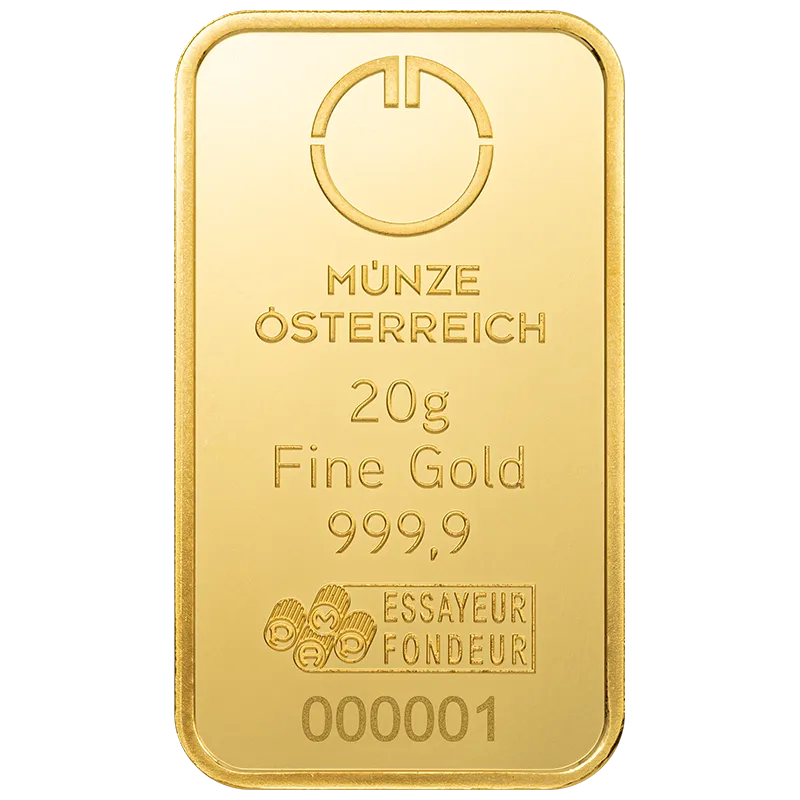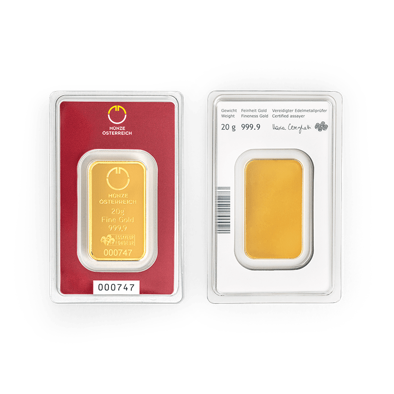 Die Münze Österreich AG bietet Anleger:innen eine breite Auswahl an Goldbarren von 1 Gramm bis 1 Kilogramm – gefertigt aus 24 Karat Gold (Feingehalt 999,9/1000). Die Prägung der Barren informiert über Hersteller, Gewicht, Feinheit und Seriennummer.