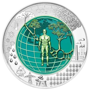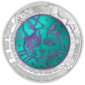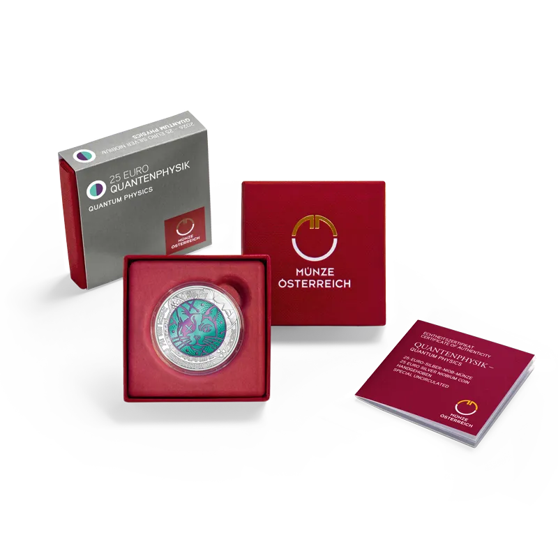 Die Wertseite zeigt das Gedankenexperiment „Schrödingers Katze“. Im Niobkern ist ihr Gesicht zu sehen; die Augen veranschaulichen die Überlagerung der Zustände „lebendig“ und „tot“. Um die Katze, bis an den Münzrand reichend, erkennt man ein instabiles Atom, Geigerzähler-Skala, Radioaktivitätssymbol sowie den Beobachter. Oben steht die Kurzform der Schrödinger-Gleichung.