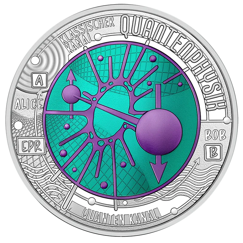 Die andere Seite würdigt Anton Zeilingers Experiment der Quantenverschränkung. Der vereinfachte Versuchsaufbau zeigt die Messstationen „ALICE (A)“ und „BOB (B)“, die über einen Quantenkanal und einen klassischen Kanal verbunden sind. Der Kern zeigt die Verschränkung der beiden Teilchen mit entgegengesetzten Spinrichtungen.