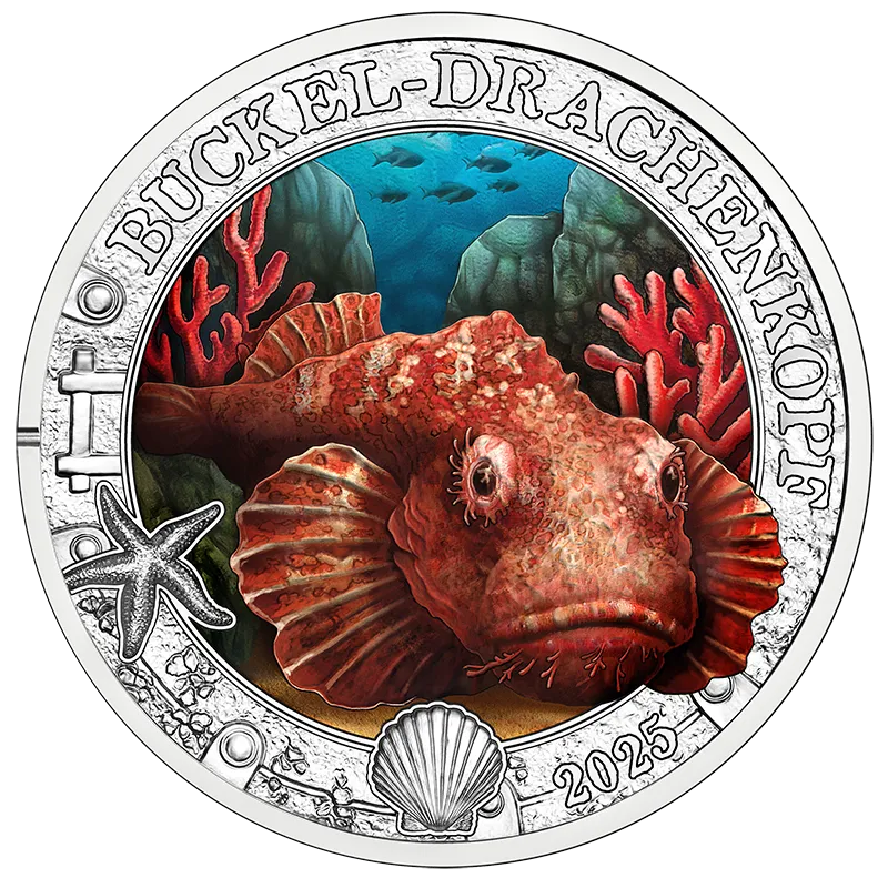 Der Buckel-Drachenkopf, auch Falscher Steinfisch genannt, ist ein Fisch aus der Familie der Skorpionfische. Er gehört zu den derzeit 180 Fischen, bei denen Biofluoreszenz nachgewiesen werden konnte. Er kann tiefrot strahlen. – Die zwölfte und letzte 3-Euro-Münze der Serie „Leuchtende Meereswelten“ gehört zu den ganz seltenen Münzen, die ihre Farbe verändern können – mit UV-Licht.