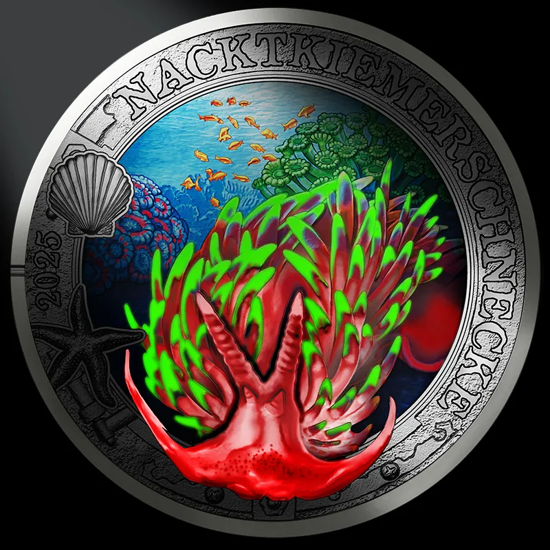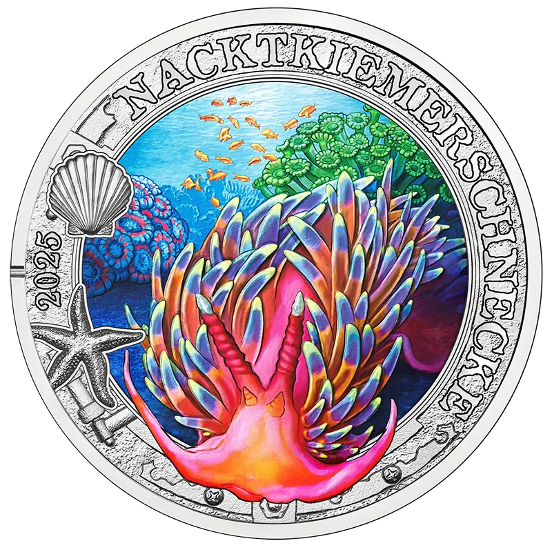 Die elfte 3-Euro-Münze der Serie „Leuchtende Meereswelten“ stellt einen Nacktkiemer aus, dessen exzentrische Form bewundernswert ist und dessen Farben sich bei UV-Licht verändern.