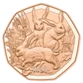 Das Hasentrio: nicht zu verwechseln mit Dürers berühmtem Feldhasen, den wir schon 2016 auf Münzen geprägt hatten; einige wenige Exemplare in Kupfer sind noch erhältlich.