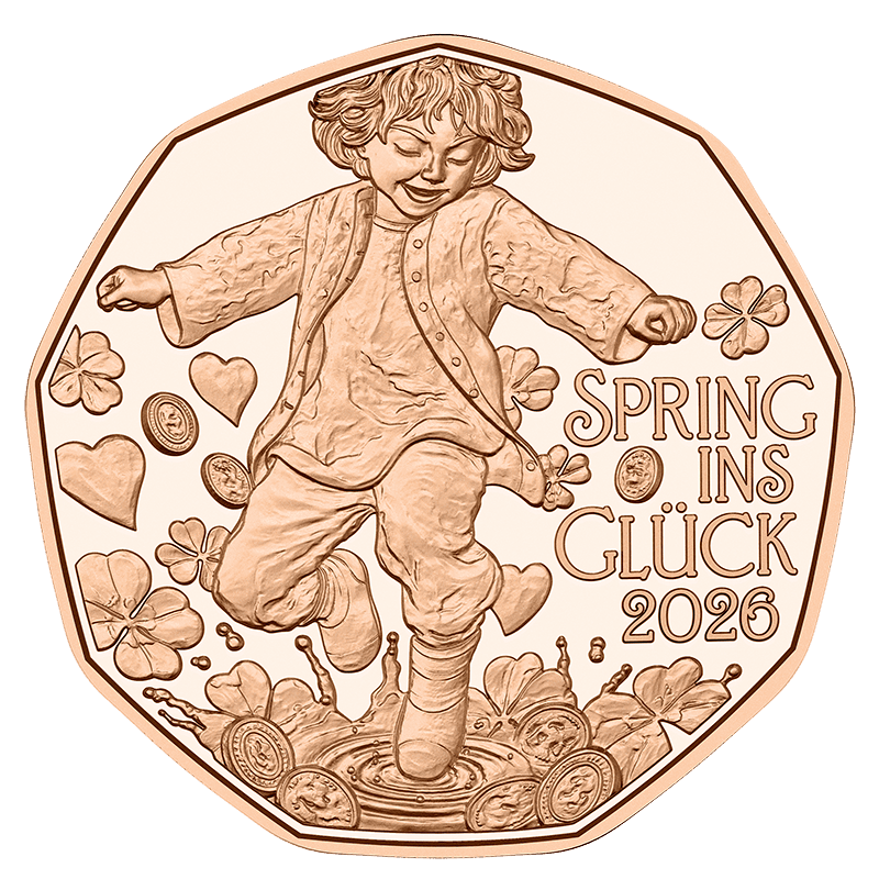 Auf der Münze hüpft ein Kind mit Genuss in eine Lacke. Es erlernt und probt spielerisch, worauf es sich im besten Fall später als Erwachsener verstehen wird: Mit Freude ans Werk gehen, raus aus der Komfortzone, rein ins Abenteuer! Unsere geprägte, neuneckige 5-Euro-Neujahrsmünze aus Kupfer ist ein kleines Kunstwerk mit großer Botschaft: Wer mit Zuversicht und Schwung ins neue Jahr springt, darf sich auf schöne Überraschungen freuen. Ein Sprung ins Glück braucht oft nicht viel – nur ein wenig Mut. Das Beste ist vielleicht nur einen Sprung weit entfernt. Wagen Sie’s!