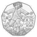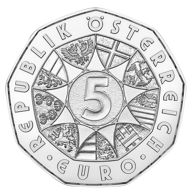 Auf der Münze hüpft ein Kind mit großem Vergnügen in eine Lacke, sodass es nur so spritzt! Wunderbarerweise besteht die Fontäne nicht nur aus Wasser, sondern auch aus Kleeblättern, Herzen und Münzen. Wie bei den vorhergegangenen österreichischen 5-Euro-Münzen sind auf der Wertseite der neuneckigen Münze die neun Landeswappen im Kreis angeordnet.