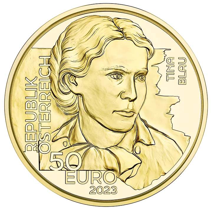 Die Wertseite zeigt Tina Blau in einer Dreiviertelansicht, gestaltet nach einem Jugendfoto. Am rechten Münzrand ist ein breiter Pinselstrich angedeutet.