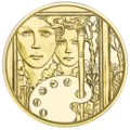 Die rechte Münzhälfte der anderen Seite thematisiert die Landschaftsmalerei, durch die Blau Bekanntheit erlangte; sie zeigt Bäume und Blumen. Die beiden Frauenporträts links verweisen auf Blaus Lehrtätigkeit auf der 1897 gegründeten Kunstschule für Frauen und Mädchen in Wien. – Dem allem vorgelagert sind der Ausschnitt eines Bilderrahmens, ein Pinsel und die Silhouette einer Mischpalette.