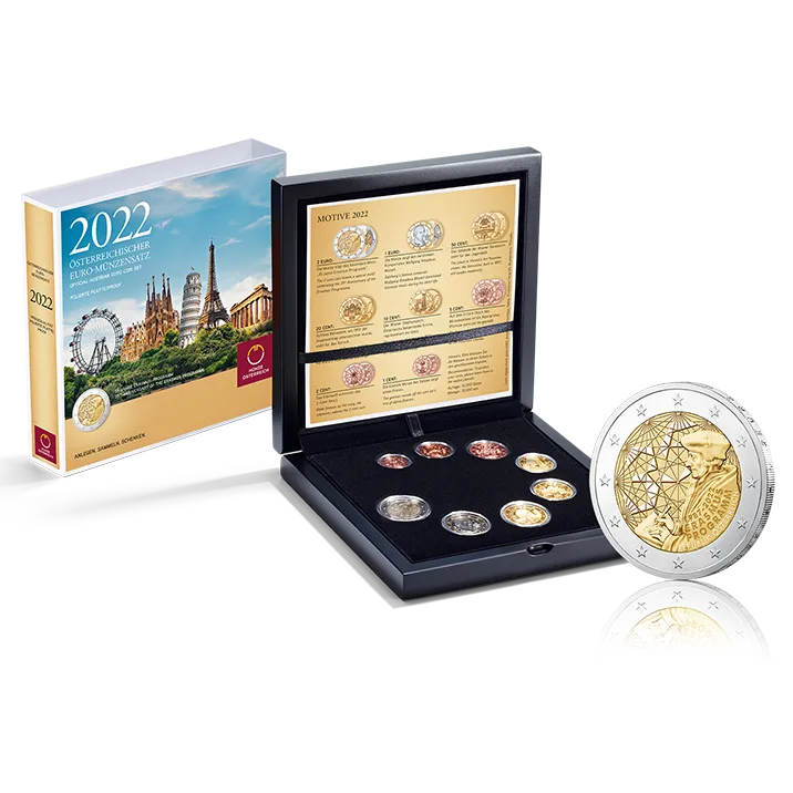 2022 feiern die Länder der EU-Währungsunion „35 Jahre Erasmus-Programm“ und das mit einer besonderen 2-Euro-Münze: der Erasmus-Münze. Sie krönt den österreichischen Euro-Münzensatz 2022, ein Set aus acht Münzen mit Werten von 1 Cent bis 2 Euro in der höchsten Prägequalität „Polierte Platte“.