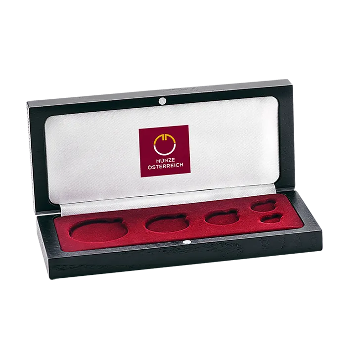 Mit diesem edlen schwarzen Holzetui setzen Sie Ihren Münzschatz so richtig in Szene. Ein Etui für den ganzen „Goldenen Philharmoniker-Satz“ mit den Größen 1, 1/2, 1/4, 1/10 Unze und der 1/25 Unze.