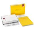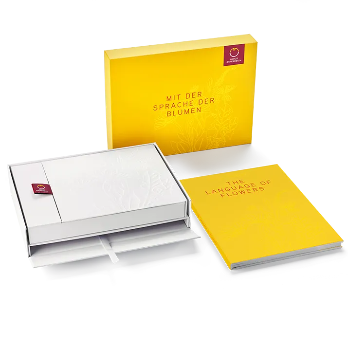In der sonnengelben Box aus hochwertigem Karton finden neben den Münzen der Qualität Polierte Platte/Proof die Zertifikate und das Buch in englischer Sprache zur Serie Platz. Das Buch ist in diesem Set bereits mit enthalten. Den Deckel des Etuis ziert ein zartes, großes Relief aus Blumen.