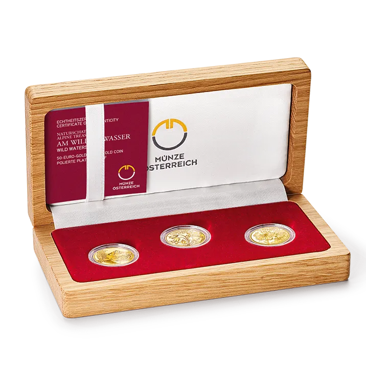 Die Sammelkassette zur dreiteiligen Goldmünzen-Serie „Naturschatz Alpen“.