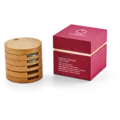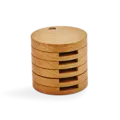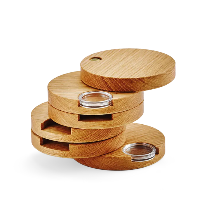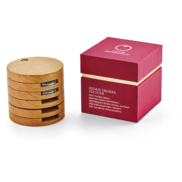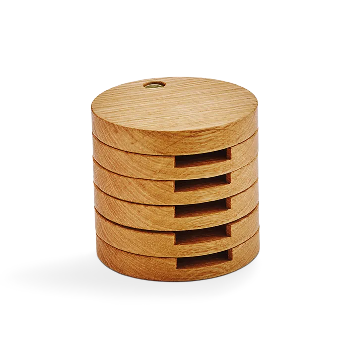 In einer dunkelroten Box verbirgt sich ein runder „Turm“ aus Holz. Das Holz ist aus massiver Eiche und stammt aus Österreich. Der Turm ist in Scheiben mit Ausnehmungen unterteilt. Für jede Münze ist eine Scheibe vorgesehen.