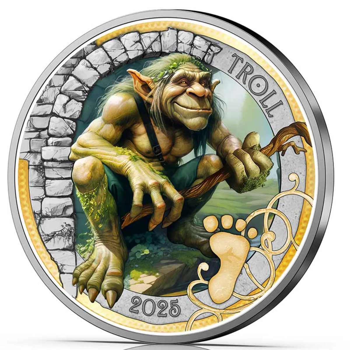 Taucht der Troll ins Schwarzlicht, beginnt er zu strahlen: Die Farben lodern kräftig auf, der Schriftzug leuchtet – und das Fabelwesen wirkt, als trete es aus der Münze hervor.