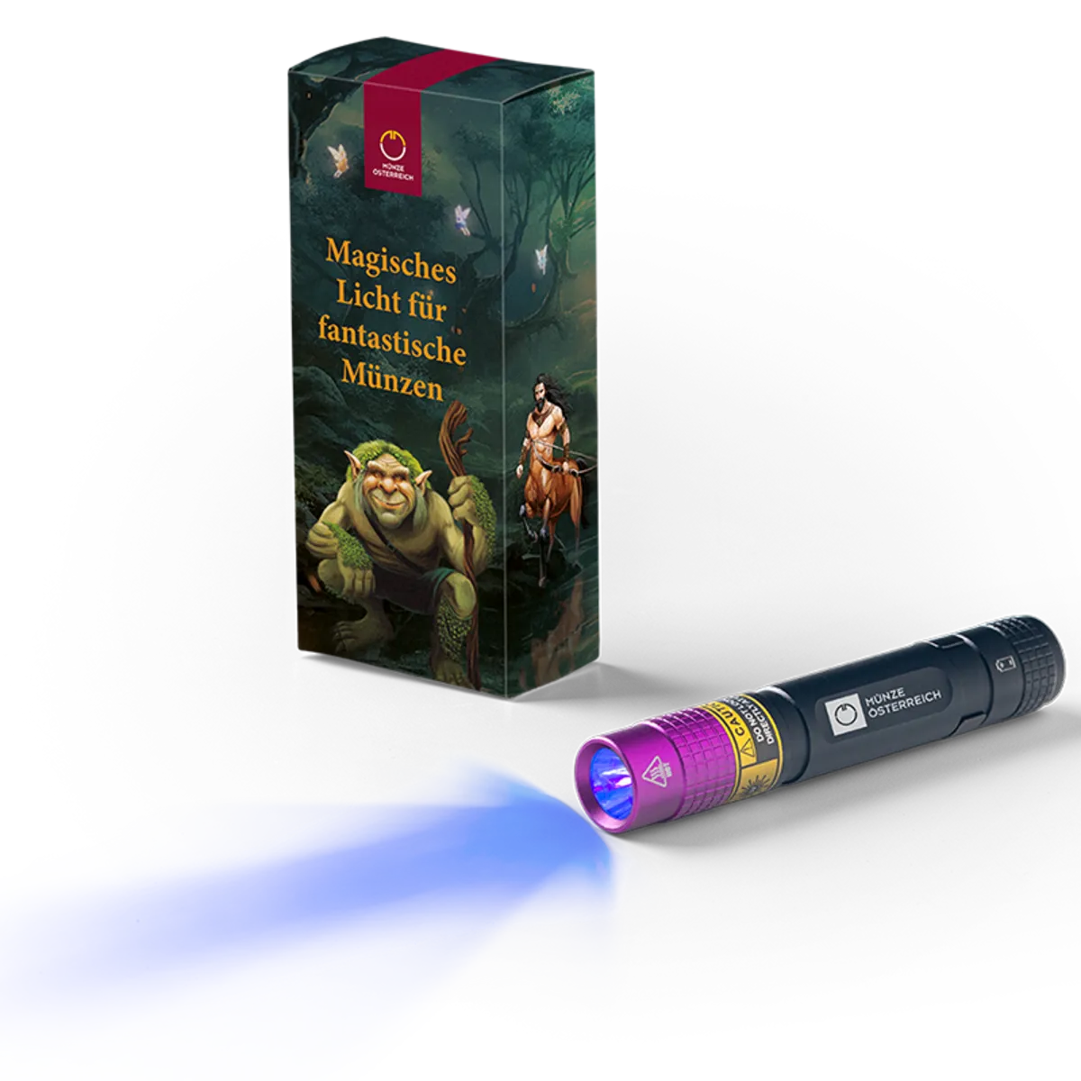 Mit dieser speziell abgestimmten UV-Taschenlampe erwachen die Münzen erst richtig zum Leben: Die fantastischen Motive verändern ihre Farben, beginnen geheimnisvoll zu leuchten und treten plastisch hervor – ein faszinierender Effekt für Sammler und Fantasie-Fans.